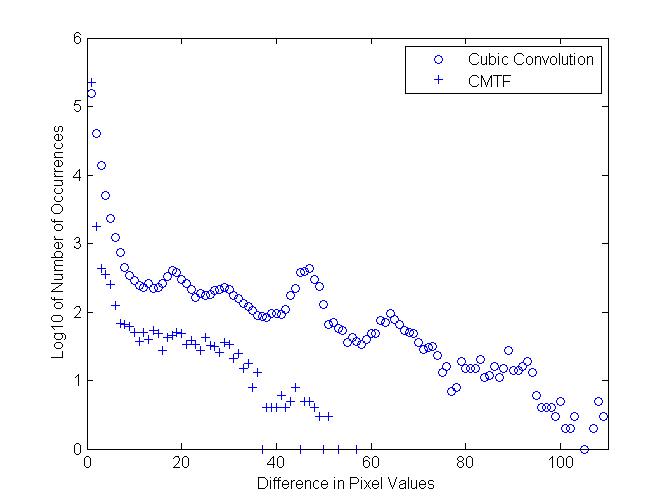 The following plot provides the histograms of the difference images between the original CT slice and image interpolated 15/32 of a pixel to the right and then back to the left, for both the CMTF and Cubic Convolution resamplers. The histograms are plotted using the base 10 logarithm of the number of occurrences to make the whole histogram easier to view. The histogram of the difference between the original and the cubic convolution image are plotted with circles. The histogram of the difference between the original and the CMTF image are plotted with plus signs.