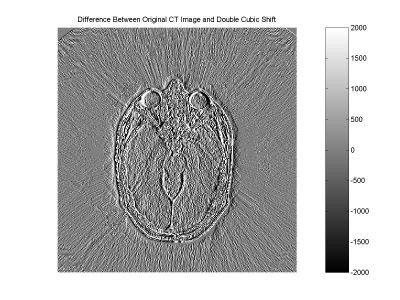 For comparison purposes, we compare this difference using a standard cubic convolution to that using a CMTF convolution. The first image shows the difference using the cubic, the second image that using the CMTF. Gray scales are provided to indicate the magnitude of the differences.